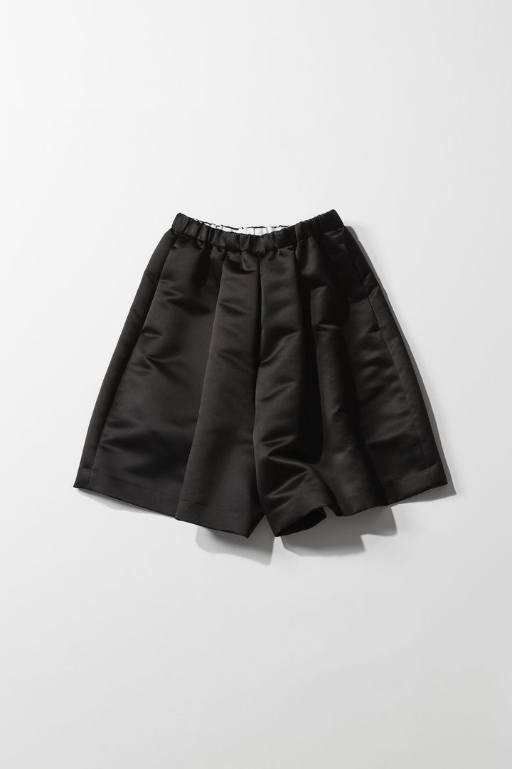 ハーフパンツというよりキュロットのようなイメージなので〝甘ニッシュ〟派にピッタリ。地厚&光沢素材でモード感も足せるのも名品の理由。Tシャツとのワンツーコーデでも完成度の高い名品です。