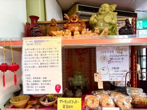 店内には、御利益がありそうな人形や置物が飾られ、たくさんの中華菓子や点心が並んでいます。お菓子には丁寧な説明が書いてあり、溢れんばかりの愛情が感じられます。それもそのはず!店の奥には工房があり毎日ご夫婦で一つ一つ手作りしているんです。 気候を見ながら調整し、作り置きしないこだわりぶりはリピーターも多く「待ってでも食べたい!」「台湾で食べるものよりおいしい♪」と喜ばれているそうです。