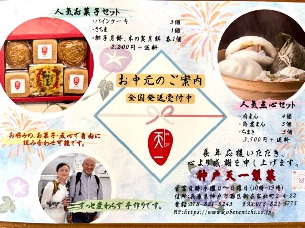 「神戸天一製菓」では、お好みのお菓子や点心の詰め合わせなど贈答品やオンライン販売、全国発送も行っています。夏休みも近いので、お中元のほか帰省の手土産にも最適ですね。 気さくなご夫婦が作る愛情たっぷりの「神戸天一製菓」を訪れてみてはいかがですか?