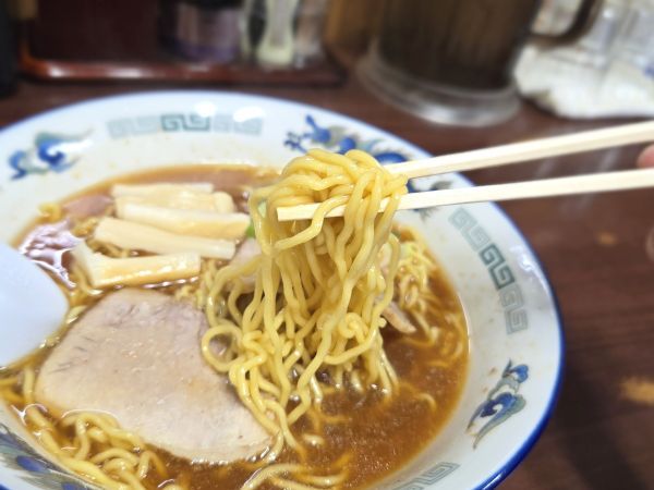 スープをまとった麺を思い切りすすると、小麦の風味、そしてプツリと切れる歯ごたえ。