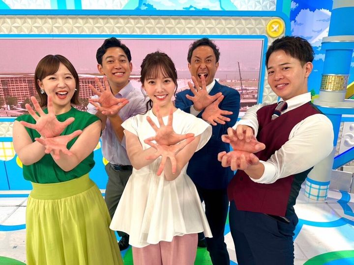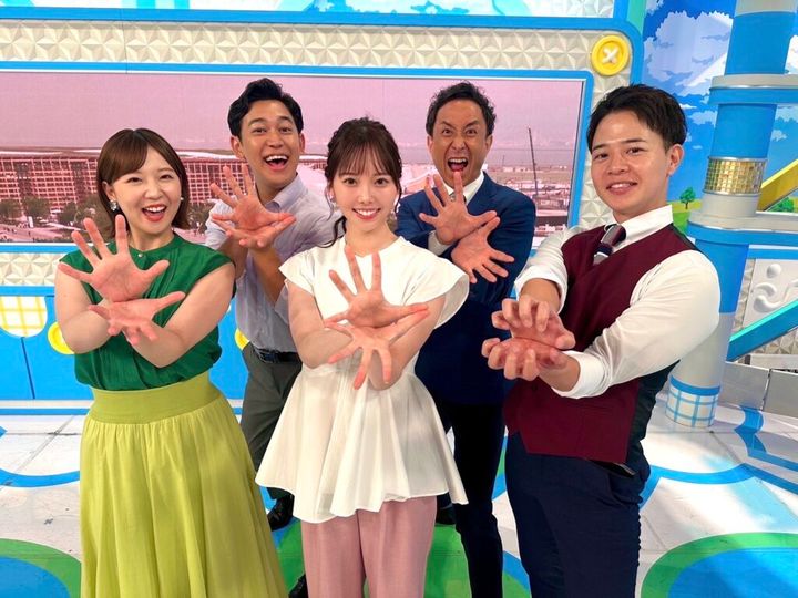 写真は、今朝のオンエア終わりに先輩方と撮った一枚ポーズは新貝の”貝”にちなんで貝のポーズをしてくださいました