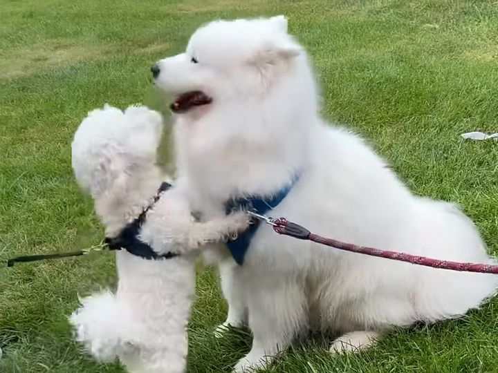 おやつに夢中なサモエドとあいさつしたい犬さんの温度差が微笑ましい