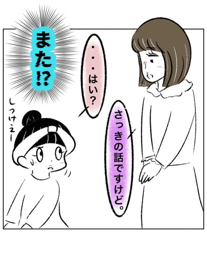 ゆかちゃんママは「さっきの話ですけど」と切り出してきて、まるさんは「・・はい?」と耳を疑います。ついさっき、「その話はもういいです!」ときっぱり断ったにもかかわらず、しつこく話を蒸し返すゆかちゃんママにまるさんはドン引きです。