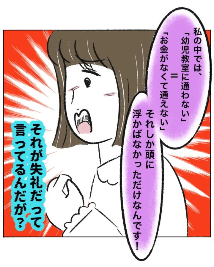 「私の中では、『幼児教室に通わない』=『お金がなくて通えない』それしか頭に浮かばなかっただけなんです!」と必死に訴えるゆかちゃんママに、「それが失礼だって言ってるんだが?」と呆れながら心の中で突っ込むまるさんでした。