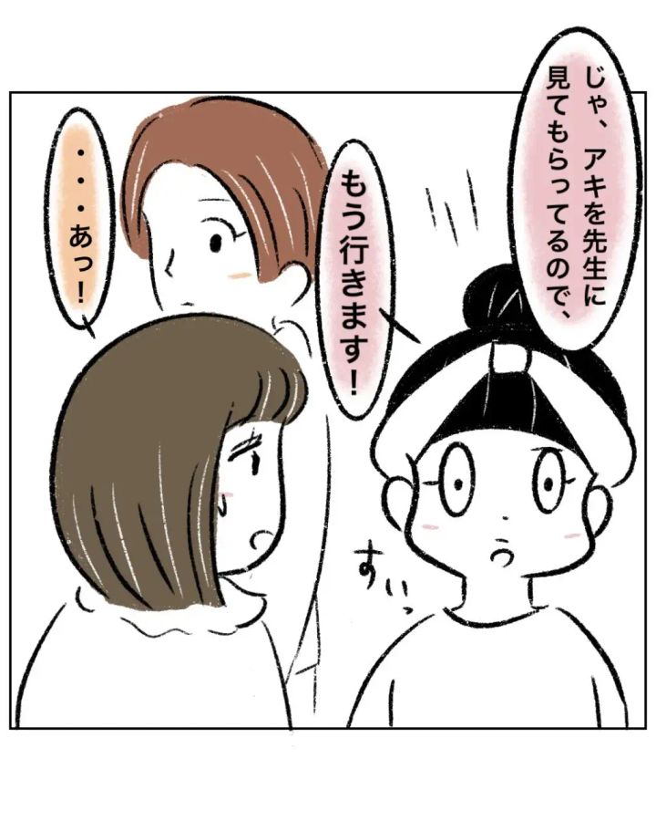 まるさんが「じゃ、アキを先生に見てもらってるので、もう行きます!」と言うと、ゆかちゃんママは「・・あっ!」と何か言いたげでしたが、まるさんはスルーしてその場を離れました。