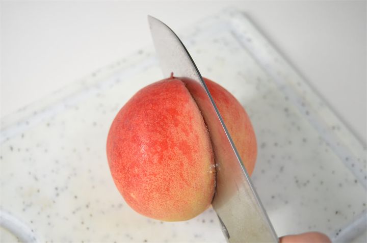 1.皮付きのまま桃を洗う。割れ目に沿って包丁で1周切り込みを入れ、2つに割ったら種を取る。