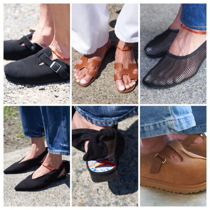 「デニムをきれいめに、きちんと見せたいときは、ハイブランドのシューズを選びます」と鈴木さん。エルメスのレザーサンダルをはじめ、バックリボンパンプス、ボッテガ・ヴェネタのメッシュパンプスなどを合わせて、エレガントにまとめました。ポップにみせたいときは、ビルケンシュトックやアグの厚底サボなどを。「足元には茶系や黒など、スタンダードで引き締まる色を選ぶとおしゃれに決まります」