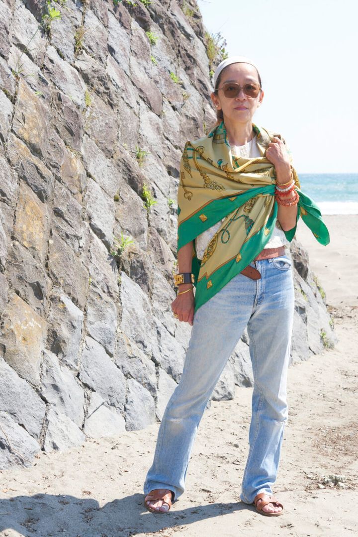 ロングヘアをポニーテールにして、ターバンやスカーフでまとめるスタイルが鈴木さん流。トップをコンパクトにすることで、カジュアルなデニムコーデがすっきりときれいめに。大人を品よく見せるブラウンカラーのサングラスや、大判のシルクストールもチェック!