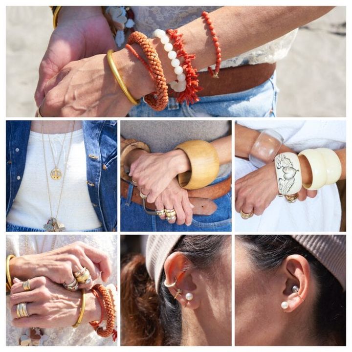 アクセサリー:(右)鋲付きバングル/エルメス、ゴールドのバングル/ ロンハーマン、(左)下から小粒サンゴのブレスレット、翡翠(ひすい)のブレスレット/ともに韓国で購入、枝サンゴブレスレット/フィレンツェのお土産、サンゴのバングル/ロンドンのアンティークマーケットで購入、左手薬指のダイヤモンドリング/母のピアスをリメイク、左手人さし指の24金リング/インドでプレゼントされたもの、右手人さし指、小指のダイヤモンドリング/マルコムベッツ、右手小指のシルバーリング/イタリアの知人から譲り受けた、ネックレス、チャーム/バーニーズ・ニューヨークなど、サングラス/グッチ、サンゴのアンクレット/イタリアで購入、ヘアターバン/バクト