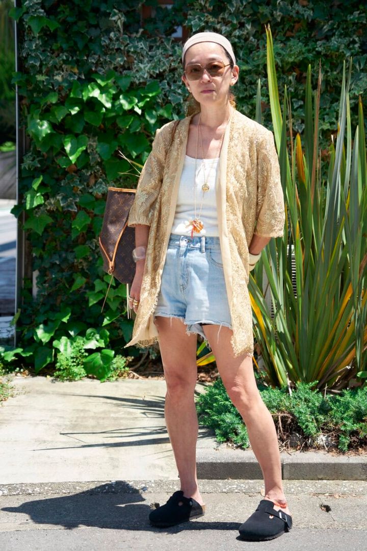 ショート丈のデニムパンツとタンクトップ。夏のリラックスウェアにゴールドカラーのレースジャケットをはおって、きれいめに。モノグラムのトートバッグとサングラスで90年代のクラブシーンにタイムスリップしたよう。