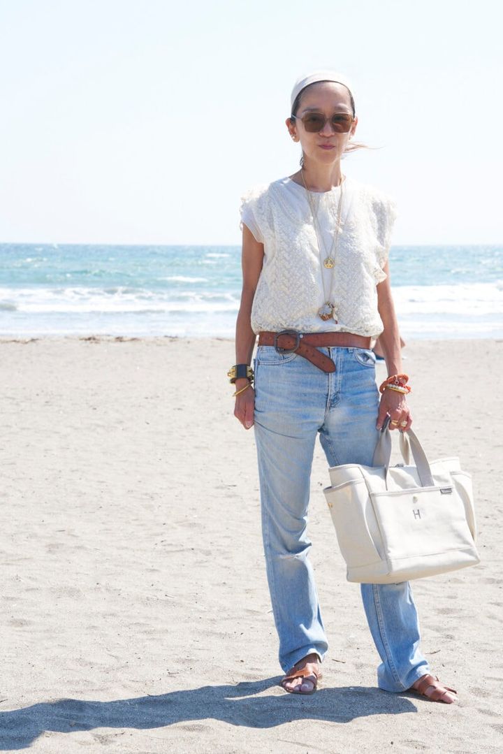 ヴィンテージショップで買ったリーバイス517。「はきこむうちに自然と色が落ち、ダメージもできました」と鈴木さん。友人のリサイクルショップで見つけたクロエのレーストップスを合わせて、スウィートなスタイリングが海辺に映えます。