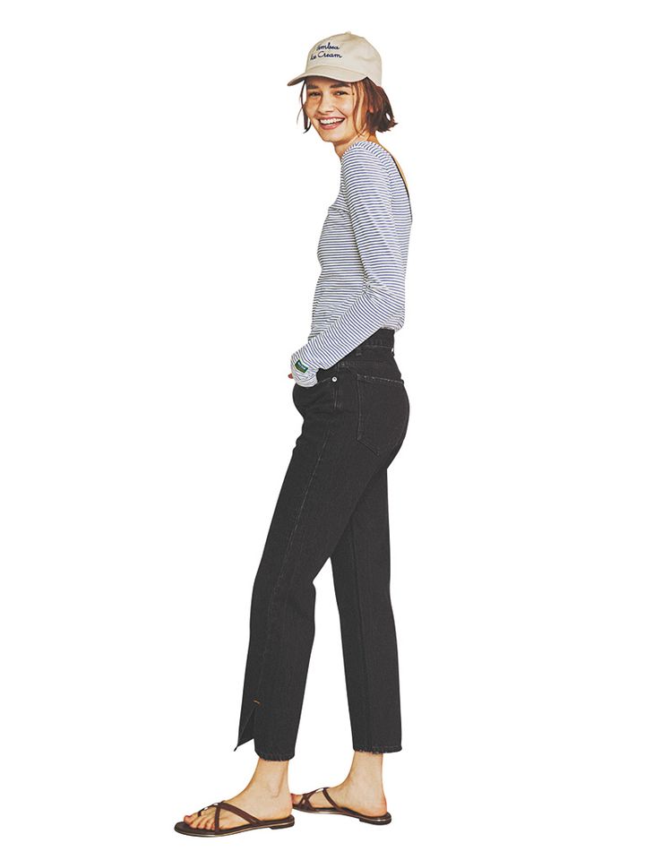 【POINT】上下細身を気楽なアイテムで選び、緊張しないIラインシルエットを形成。スラックスのようにきちんと見える黒デニムは、ビーサンくらいラフものを合わせることで隙が生まれ、コンサバ感を払拭。