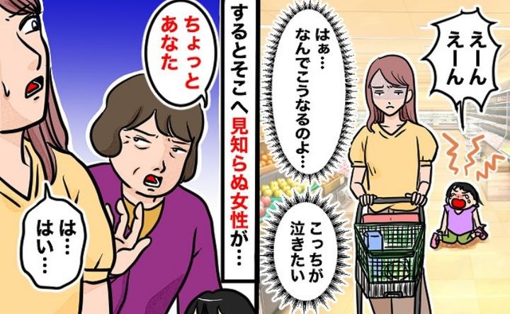 1歳4カ月の長女を連れて、スーパーへ買い物に行ったときのお話です。その日は買わなければならない物が多く、いつもよりも時間がかかっていました。娘も最初はおとなしくカートに座っていてくれたのですが、途中で「降りたい」と連呼して泣き出してしまいました。仕方なくカートから降ろしたものの、娘は座り込んでついてきません。すると、見知らぬ女性が「ちょっとあなた!」と強い口調で声をかけてきたのです……。
