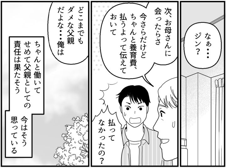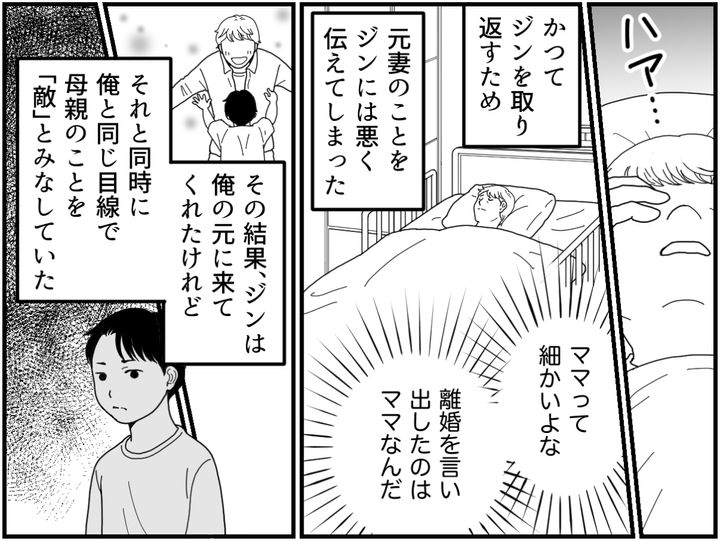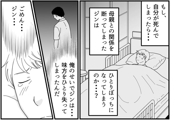 自分が「死ぬかもしれない」と思ったとき、猛烈に後悔したのがジンと元妻を引き離したことだった。あのときは俺も寂しくて必死だった。けれどそんなことは言い訳にならない。俺はジンに対して最低のことをしてしまったし、申し訳ないなんていう言葉では済まない。