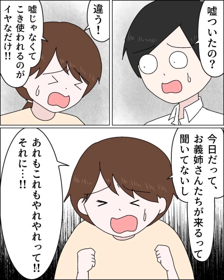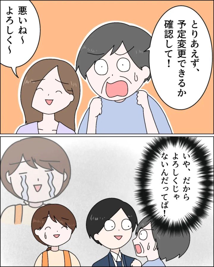 「とりあえず、予定変更できるか確認して!」と全く諦めない義母。「悪いね~よろしく~」と軽い感じで答えるミユキさん。「いや、だからよろしくじゃないんだってば!」と心の中で涙を流しながら抵抗した私。