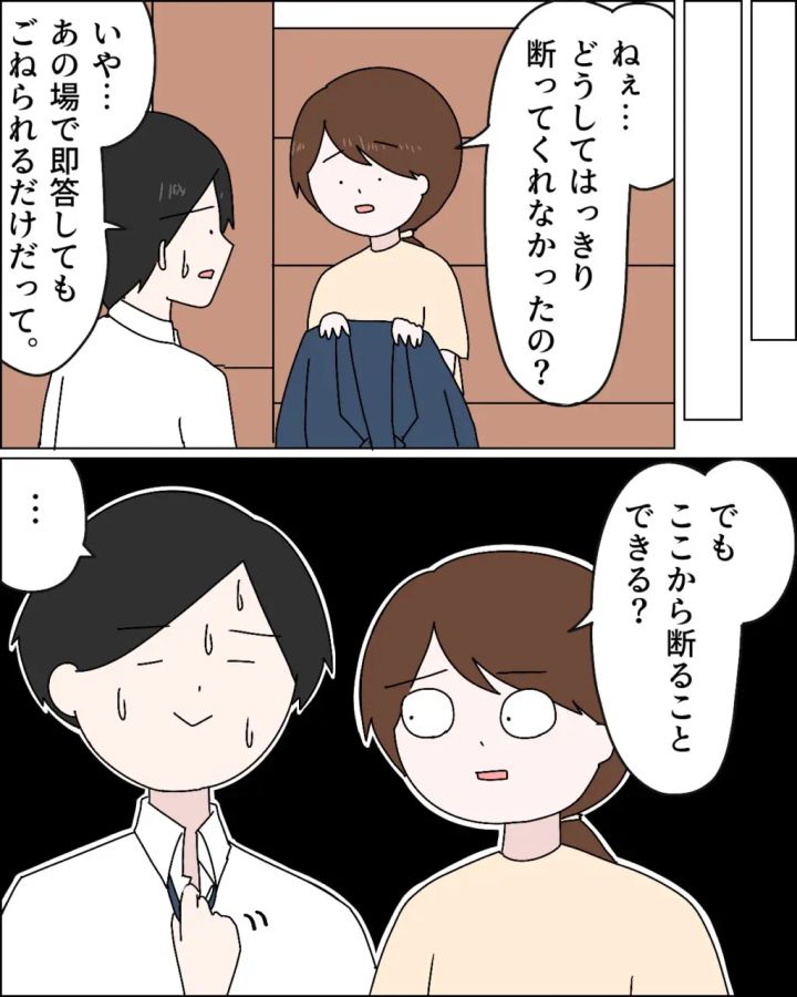 部屋に戻った後、「ねぇ・・どうしてはっきり断ってくれなかったの?」ヒジリにたずねると、「いや・・あの場で即答してもごねられるだけだって」と答え、「でも、ここから断ることできる?」私の言葉に「・・・」何も言えないヒジリ。