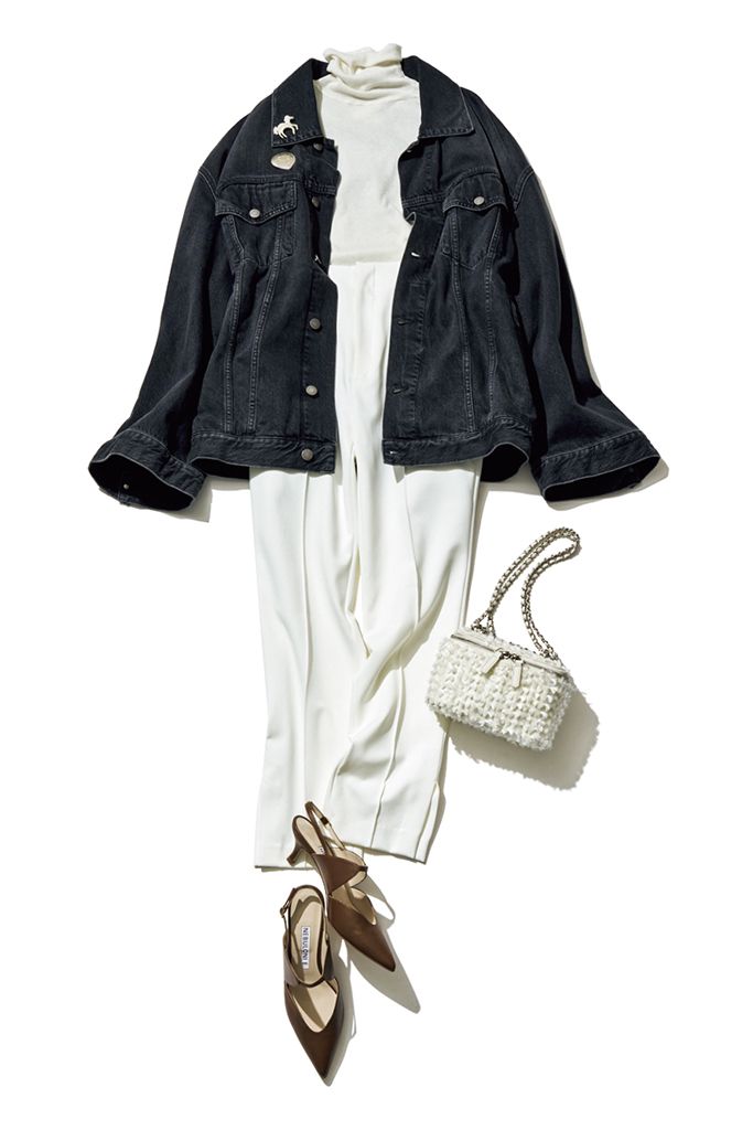 白タートルは着まわし。黒Gジャン/HAIKURE(ショールーム ロイト) 白パンツ/オスロー(フィルム) ブローチ/ADRAR(ZUTTOHOLIC) バッグ/TSURU By MARIKO OIKAWA パンプス/ネブローニ