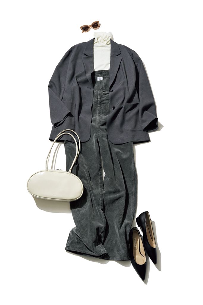 やさしい知性をかもせるグレーのワントーン。ともするとぼやけがちな色だから、雰囲気をくずさずアクセントを加えられる少量の黒白が頼りに。白タートルの透けた質感でコーデュロイを涼しく演出。