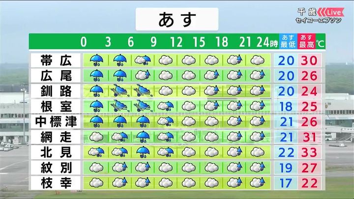 雨が降り、道東で昼前まで激しい雷雨のおそれがあります。そして蒸し暑いです。最低気温は20度前後、最高気温は30度くらいで、熱中症にも注意して下さい。