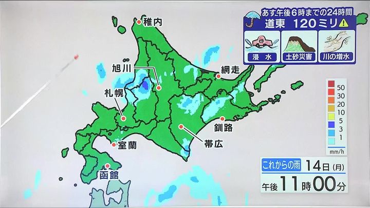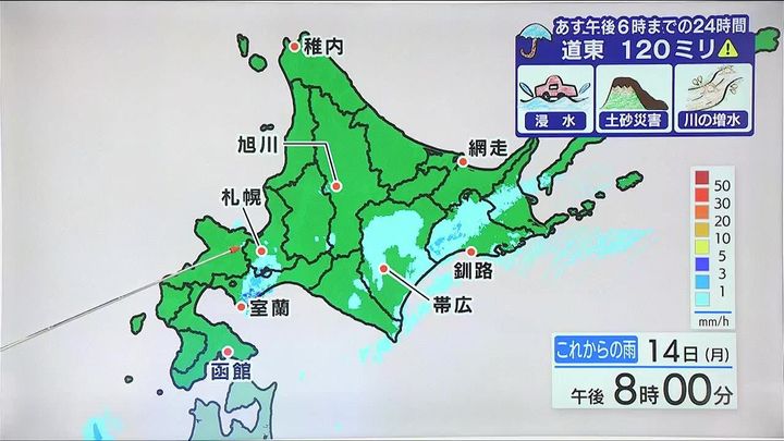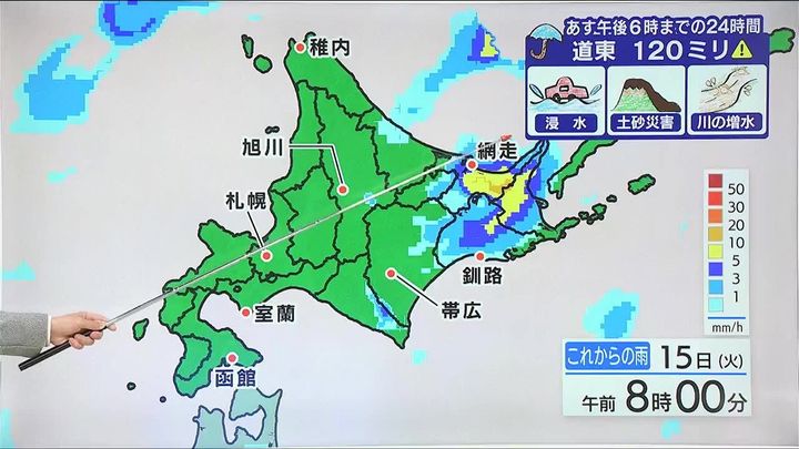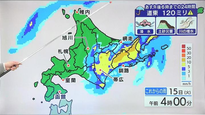 あす15日(火)夕方までの24時間に道東の多いところ120ミリの大雨です。低い土地の浸水や土砂災害、河川の増水にも注意して下さい。