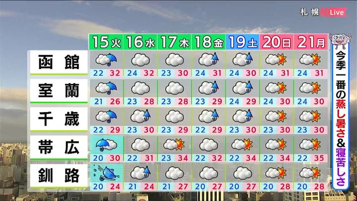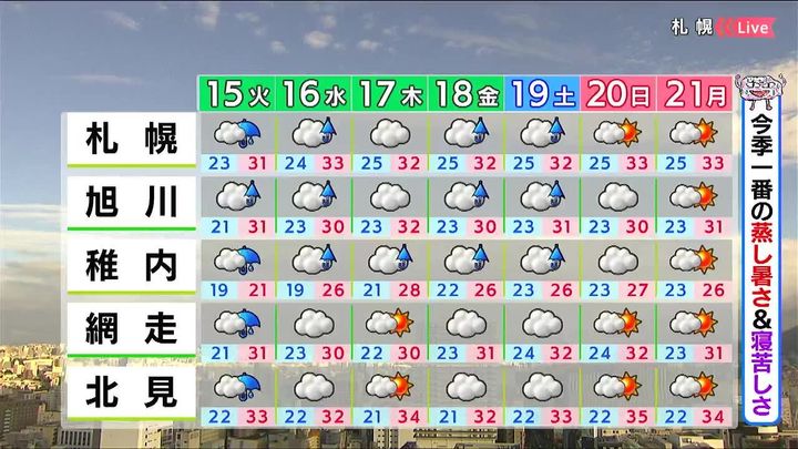 曇り空で、夕方以降、海岸部から雨が降り出すでしょう。風は宗谷地方でやや強く吹きそうです。旭川ではきょう14日(月)今年初の猛暑日35.1度を観測しましたが、あす15日(火)も31度と暑さが続きます。