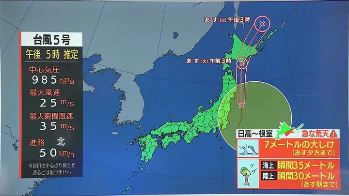 台風5号は三陸沖を北上し、あす15日(火)午前中に北海道に上陸するおそれがあります。北海道に台風が上陸するのは9年ぶりです。時速50キロと自動車並みの早さで近づくため、急に荒れるおそれがあります。日高から根室にかけての太平洋側では、いずれも日付が変わってから、あす夕方まで7メートルの高波に、最大瞬間風速は朝まで陸上で30メートルと歩けないくらいの暴風にも警戒が必要です。