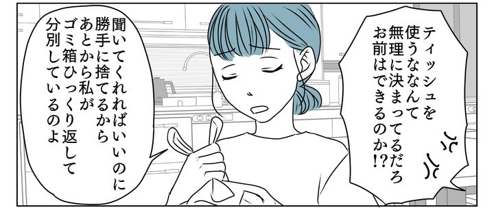 私は「ティッシュを使うな」なんて一言も言っていません。使いすぎないでほしいと言っているだけです。それに分別についても、義母がわからないまま勝手に捨てるせいであとから私が分別し直すはめになっているんです。