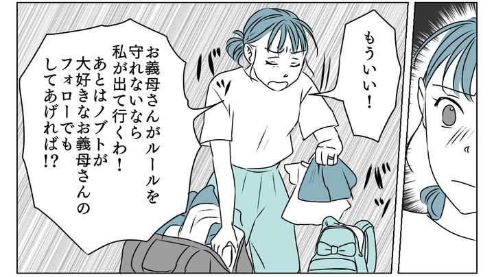 私がきちんと理由を話して、「義母の行動は困る、迷惑がかかっている」と説得を試みても、ノブトは「もっと気を遣ってやれ」の一点張り。ノブトとしては、私が我慢すればいいと考えているのでしょう。どうして同居に反対した私が義母のフォローを押し付けられなければいけないのでしょうか……。