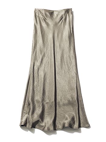 カーキサテンスカート/SACRA(インターリブ) ごまかしがきくIラインの正解は、柔らかな素材感にこそあり。上質なサテン素材が描き出す繊細な光沢も、脚のラインをさりげなく拡散させる秘密。シンプルなトップスと合わせるだけで洗練された装いに仕上がる、ゴールドがかったカーキもポイント。