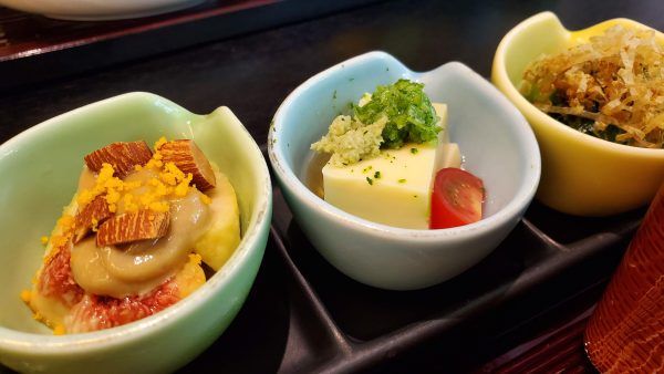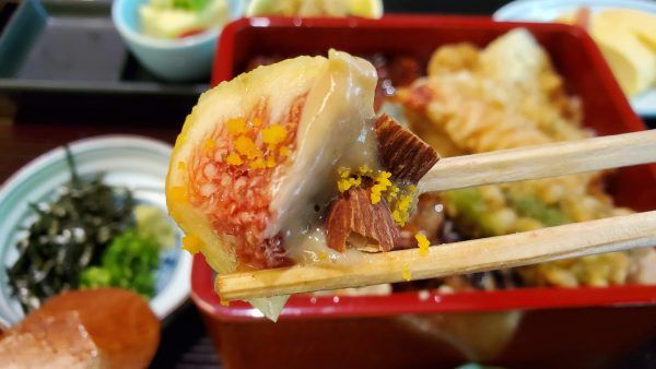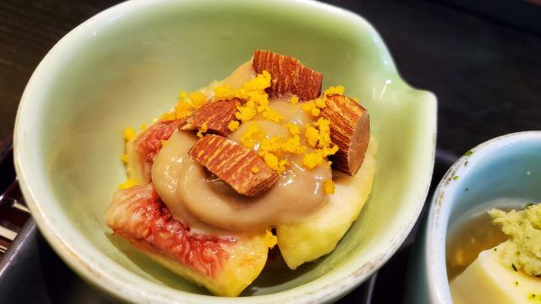 「本日の小鉢」の3品の中の1つ、福岡県産のいちじく「とよみつひめ」の胡麻クリーム添えは、完熟の甘みと濃厚な胡麻クリームが相性抜群。トッピングのアーモンドの香ばしさと食感もよくて、想像をはるかに超えたおいしさでした。なお、入荷状況や時期で小鉢の内容が変更になるそうです。