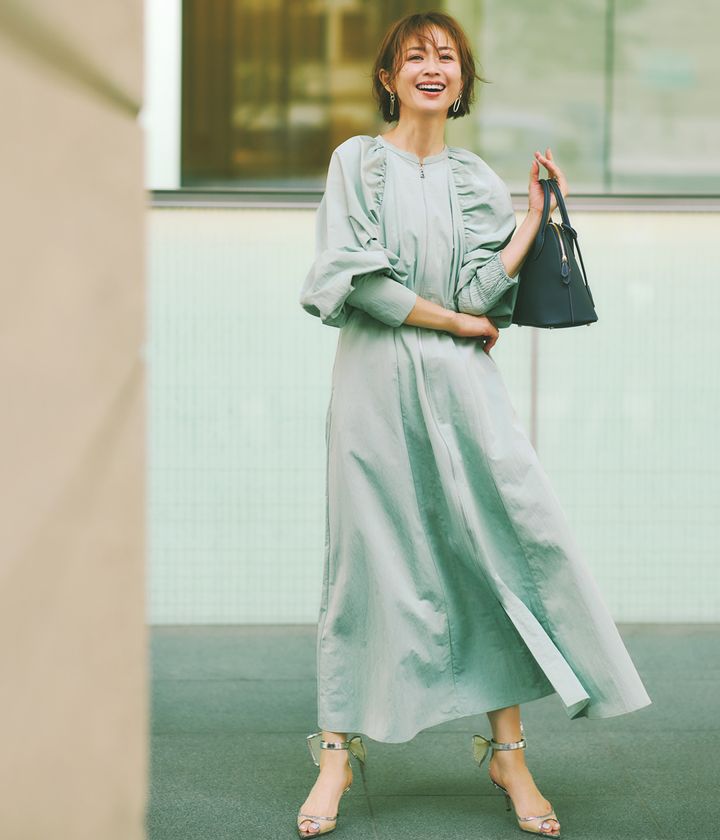 好感度大の【くすみグリーンワンピ】は華やか小物で盛って正解!