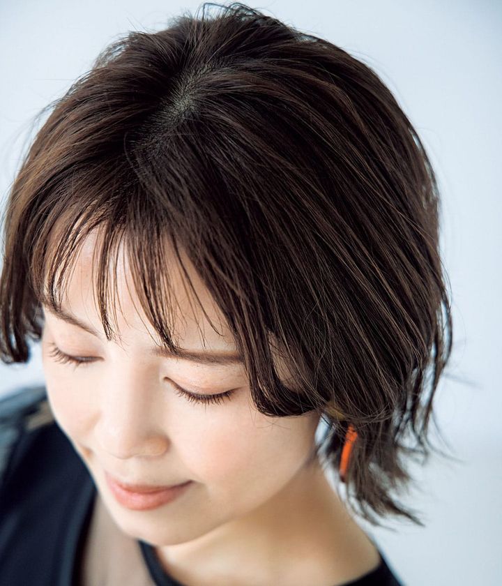 髪にハリがなく、ボリュームもないため、トップ・サイドともにぺったりとして、薄毛が目立つ状態。そのため、顔も大きく見えてしまうのが悩みのタネだったという田畑さん。ポイントは、トップやこめかみの気になる部分を髪が覆うようにカットすること。薄く前髪を作り、広くなった額をカバーして、M字形サイドバングでこめかみを覆います。丸みのある立体的シルエットに仕上げ、華やかで若々しい雰囲気に。
