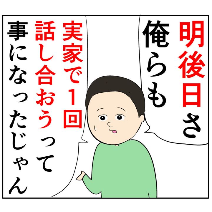 「明後日さ、俺らも実家で1回話し合おうって事になったじゃん」と、モモさん達と同じ日に実家へ行く予定だったことを思い出した次郎さん。
