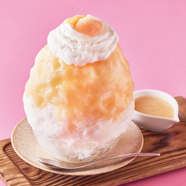 白桃のコンポートを贅沢にのせたかき氷は、ヨーグルトと白あんが隠し味。和と洋がバランスよく融合した、口どけ優しい味わいです。とろける白桃の甘さに癒やされて。