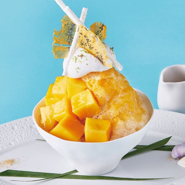 世界的シェフが手がける一品は、まるでデザートコースのフィナーレのよう。濃厚なマンゴーにパッションフルーツの酸味が爽やかに広がり、ヨーグルトのクリームが味に奥行きを加えます。見た目も涼やかな大人のかき氷です。