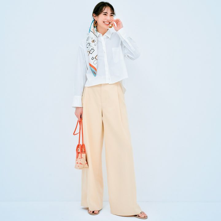 クリーンな白シャツは、ミニ丈を選ぶことでグッと今どきな印象に。柔らかいオレンジカラーのワイドパンツでやさしい雰囲気に仕上げ、遊び心のあるスカーフとミニバッグで、シンプルコーデに華やぎを添えて。きちんと見えも叶う、通勤から休日のお出かけまで頼れる着こなしが完成します。