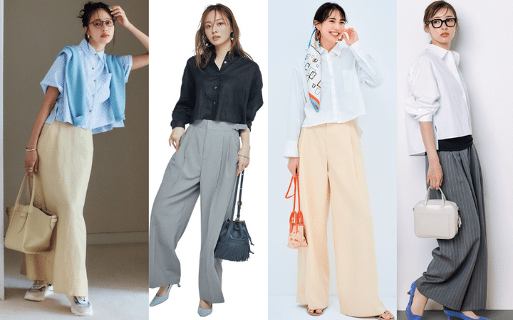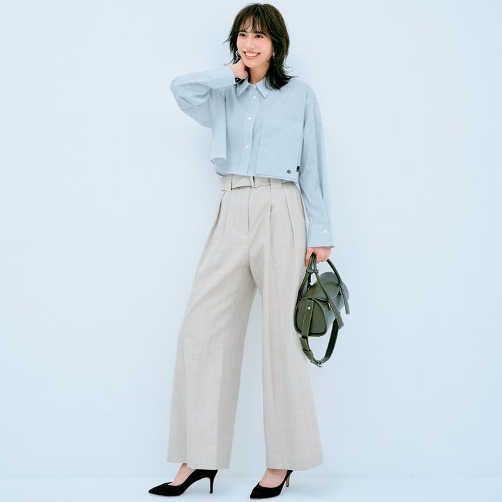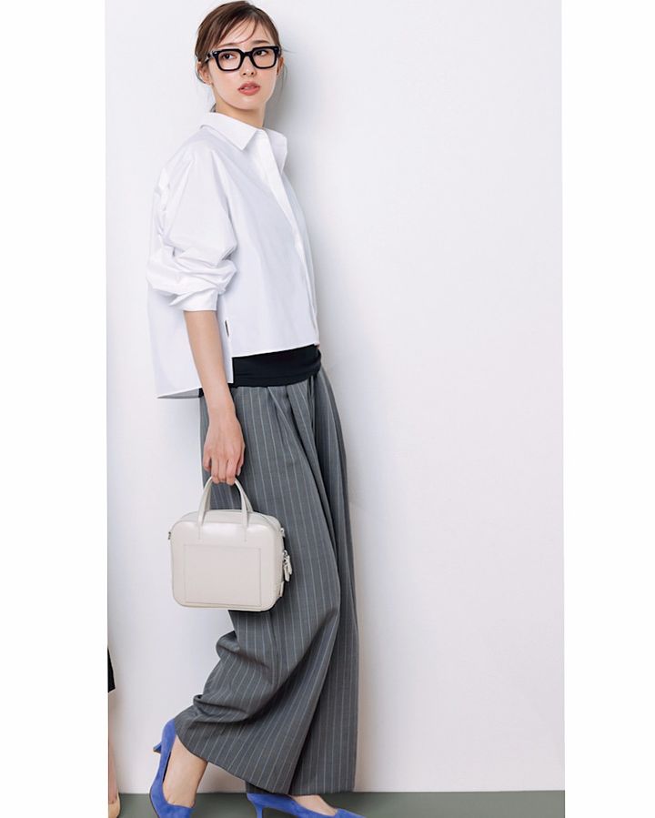 パリッとした白シャツに、ストライプのワイドパンツを合わせて大人の余裕を演出。黒インナーで引き締めつつ、足元のブルーパンプスで上級者なアクセントを。スクエアバッグやメガネ小物で、品よく知的に仕上げるのが今っぽい。