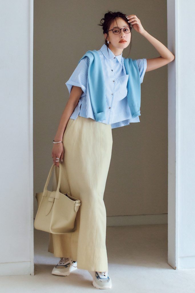 ゆるっとシルエットのミニ丈シャツに、ストンと落ちるロングスカートでつくる好バランスなサマースタイル。スニーカー合わせで抜け感を出しつつ、きれいめ小物で大人の品格も忘れずに。肩掛けニットやラウンドメガネで、洒落感をさりげなくプラスして。