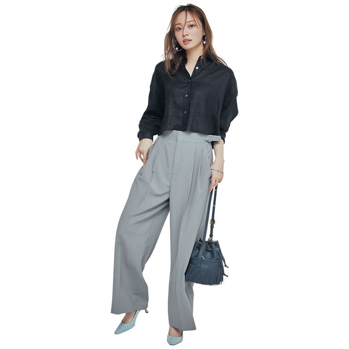 ハンサムなグレーのワイドパンツに、シアー感のあるブラックのミニ丈シャツで抜けをひとさじ。シャープだけどどこか柔らかい、都会的な雰囲気が今の気分にちょうどいい。淡色パンプスとフリンジバッグで、こなれ感と女らしさをさりげなく演出して。
