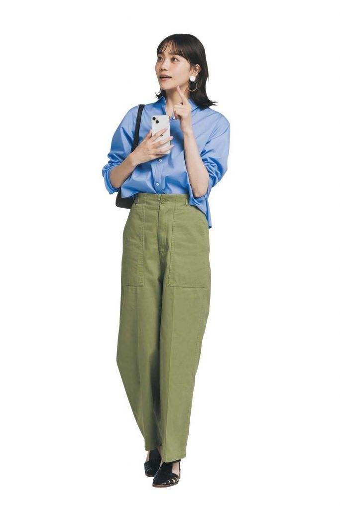 淡いブルーシャツとエクリュパンツの組み合わせで、初夏にぴったりな爽やかスタイルの完成。ウエストイン&ヒール合わせで、スタイルアップもさりげなく叶えて。カーキバッグでほんのり辛口に締めて、大人の余裕を香らせて。
