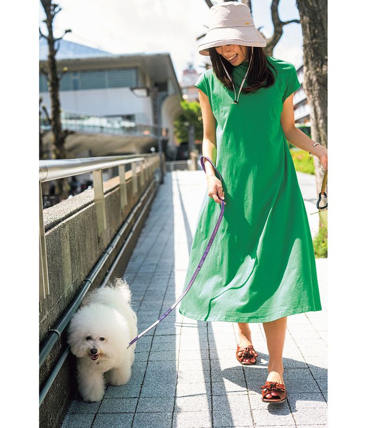 汗をかいてもシミにならないから安心。散歩後そのままお料理も送迎も可能に。涼しげ素材のカラーワンピが夏の日々を乗り切る新相棒。