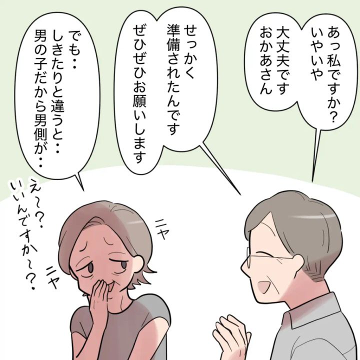 集まった人の中で年長者と言えば私の父。みんなの視線が集まった父は、「あっ私ですか?いやいや大丈夫ですおかあさん。せっかく準備されたんです。ぜひぜひお願いします。」と義母に言いました。父から言われて「でも・・・しきたりと違うと・・・男の子だから・・・」などと言いながらも、ニヤニヤと喜びが隠し切れない様子の義母。「いいんですか~?」と言い始めました。