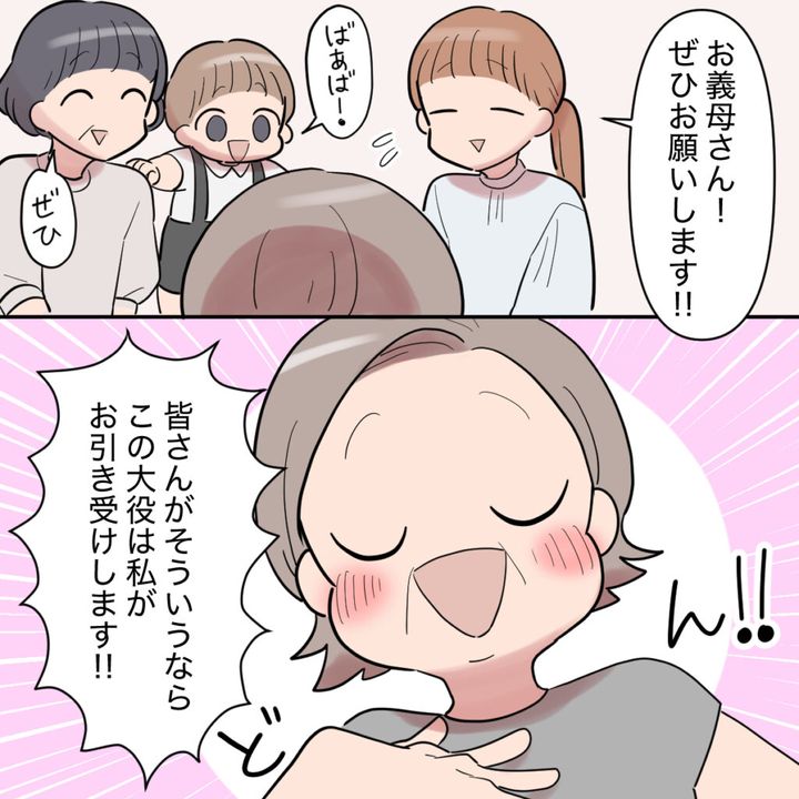 「お義母さん!ぜひお願いします!!」と私も義母にお願いしました。ようやく義母は「皆さんがそう言うなら、この大役は私がお引き受けします!!」と、満足そうに胸を張りました。