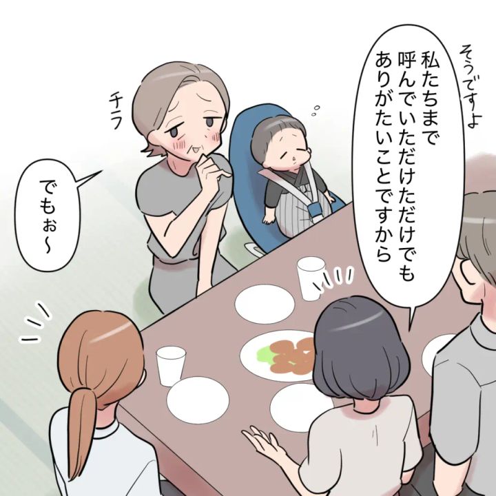 孫のこととなると周りが見えなくなるほど大暴走するほどの溺愛ぶりを見せる義母。マキさん夫婦はそんな義母の自分勝手な行動に振り回されていました。二男ハルタくんのお食い初めは自分でやりたいと張り切りだした義母を誰も止められずに全面的にお任せすることになりましたが、当日、義実家へ招かれるととても立派なお食い初めのお料理が完璧に準備されており、マキさん夫婦はもちろんのこと、招待されたマキさんの両親も「すごい」「ひとりで準備大変だったのでは」と目を見張り、義母は嬉しそうです。義母が用意してくれていたハルタ君の衣装に着替え、いよいよお食い初めが始まります。