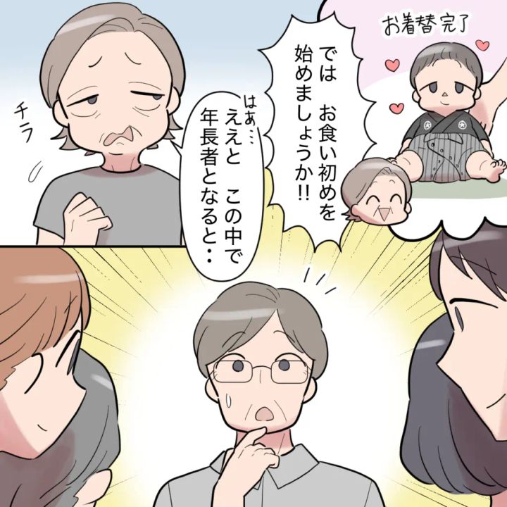 ハルタのお着替えが完了し、「ではお食い初めを始めましょうか!」と嬉しそうに言った義母。続けて「ええと、この中で年長者となると・・・」と言いましたが、義母の顔が少しつまらなそうに歪んだような気がしたのは私だけでしょうか。