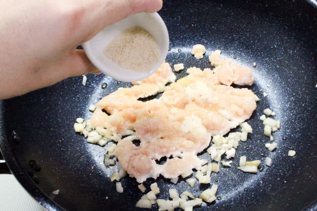 しょうがとひき肉を1分ほど炒めてから、砂糖を加えました。砂糖の保水効果で、パサつきがちな鶏ひき肉がジューシーに仕上がりますよ。2分ほど炒めると、ひき肉の色が変わりました。
