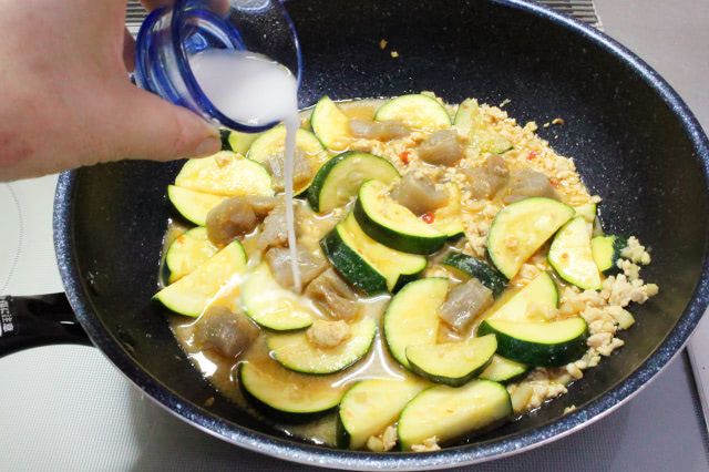 4. 1のこんにゃくと2のズッキーニを加えて、油がなじむ程度に炒めます。水、しょうゆ、みそ、酒、豆板醤を加えてひと煮立ちさせ、弱火で10分ほど煮ます。
