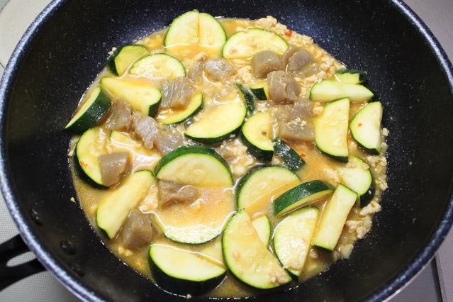 ズッキーニとこんにゃくを1分ほど炒め、油を絡めてから、水と調味料を加えました。こんにゃくを少し炒めるだけでも、味染みがよくなるそう。