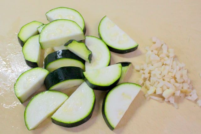 2. ズッキーニは1cm幅の半月切り、しょうがは粗みじん切りにします。