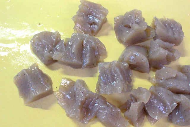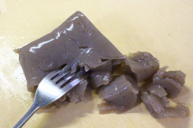 フォークで引きちぎったこんにゃくが、こちらです。フォークの筋が付き、表面がデコボコに。スプーンよりもフォークでちぎった方が、味染みがよさそう♪